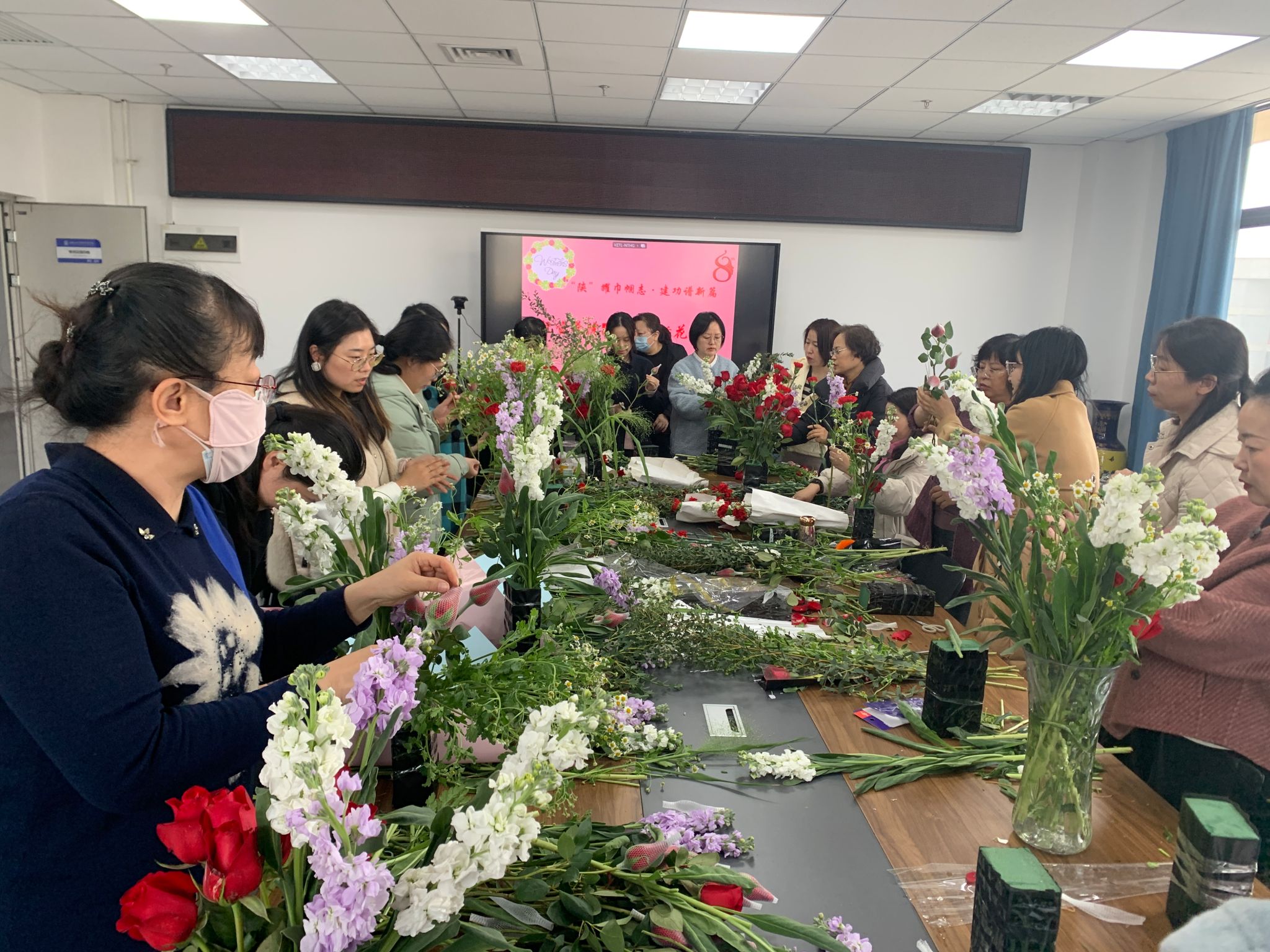 活动中,女教职工们充分发挥想象力和创造力,用心构思、精心搭配,将一朵朵鲜花错落有致地插入花篮中,创作出一件件独具匠心、赏心悦目的插花作品。活动现场花香四溢,欢声笑语不断,洋溢着温馨浪漫的节日氛围。